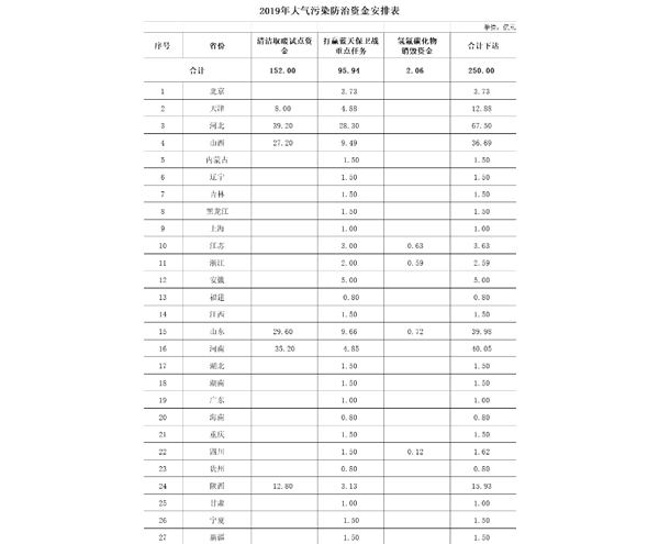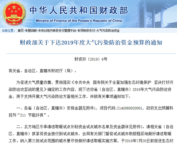 日前,財政部印(yin)發《關(guan)于下達2019年(nian)度大(da)(da)氣污(wu)染防治(zhi)(zhi)資金預算的通知(zhi)》。文(wen)件提出,為促進(jin)大(da)(da)氣質量改善,貫徹落(luo)實大(da)(da)氣污(wu)染防治(zhi)(zhi)工(gong)作,現下達各省(自治(zhi)(zhi)區、直轄市)2019年(nian)大(da)(da)氣污(wu)染防治(zhi)(zhi)資金,共計250億(yi)元,用于支持(chi)開(kai)展大(da)(da)氣污(wu)染防治(zhi)(zhi)方面相關(guan)工(gong)作。其中,2019年(nian)北方地(di)區冬季(ji)清潔取(qu)暖(nuan)試點資金安排總計152億(yi)元。