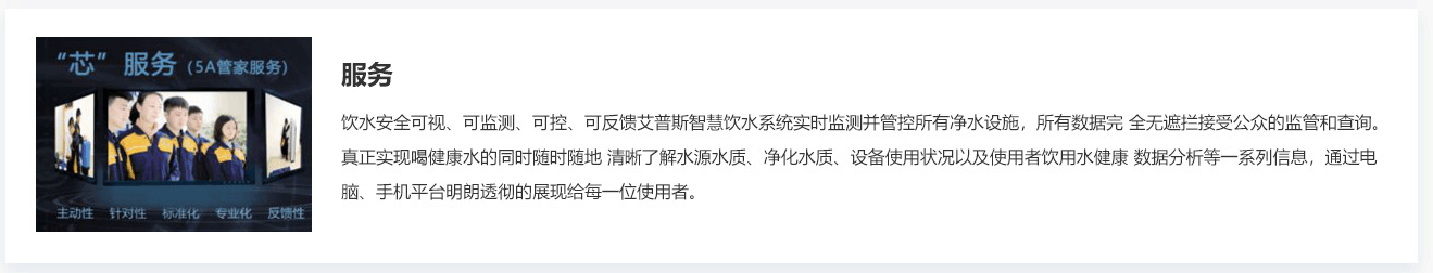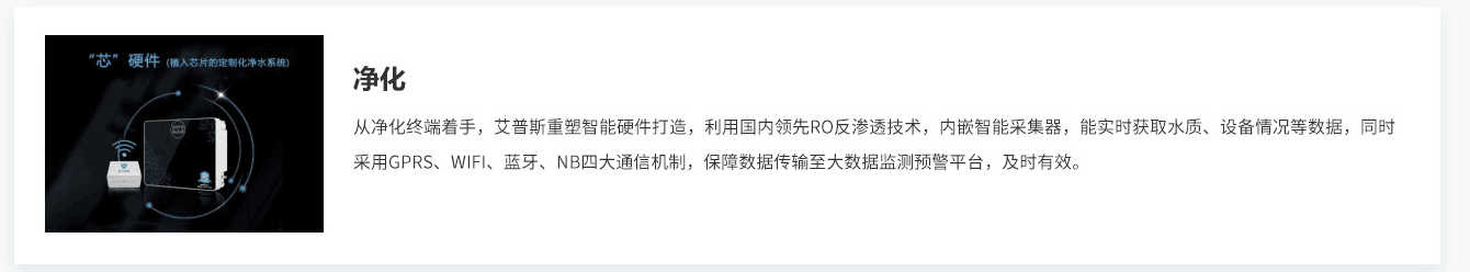 艾普斯智(zhi)慧飲水(shui)系統需要(yao)解決的不(bu)僅僅是(shi)(shi)監(jian)測水(shui)質安(an)全,更重要(yao)的是(shi)(shi)讓整個監(jian)測過程(cheng)公開化(hua)(hua)、透明(ming)化(hua)(hua)、可視(shi)化(hua)(hua),從凈化(hua)(hua)全鏈(lian)路保障(zhang),將全過程(cheng)水(shui)質變化(hua)(hua)、監(jian)測、預警(jing)、服務、評價(jia)等信(xin)息通過可視(shi)化(hua)(hua)平(ping)臺, 讓整個環節的參與者全部看(kan)得(de)見,讓各(ge)方各(ge)界共同監(jian)督(du)以切實(shi)保障(zhang)飲水(shui)安(an)全能夠持續有效地得(de)到保障(zhang)。