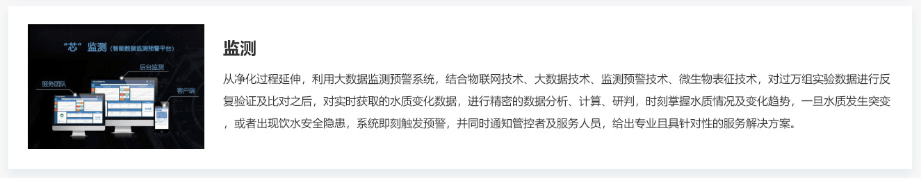 到(dao)(dao)主動監(jian)(jian)測主動預警(jing)主動服務安全可(ke)(ke)靠(kao)。整(zheng)體方(fang)案將(jiang)凈化(hua)、監(jian)(jian)測、服務全過(guo)程打通,獨具(ju)信(xin)息化(hua)的管控(kong)、 數據驅動服務,讓水(shui)安全全過(guo)程看(kan)得(de)見,從(cong)(cong)(cong)而(er)持(chi)續保(bao)障孩子們(men)的飲(yin)水(shui)安全。